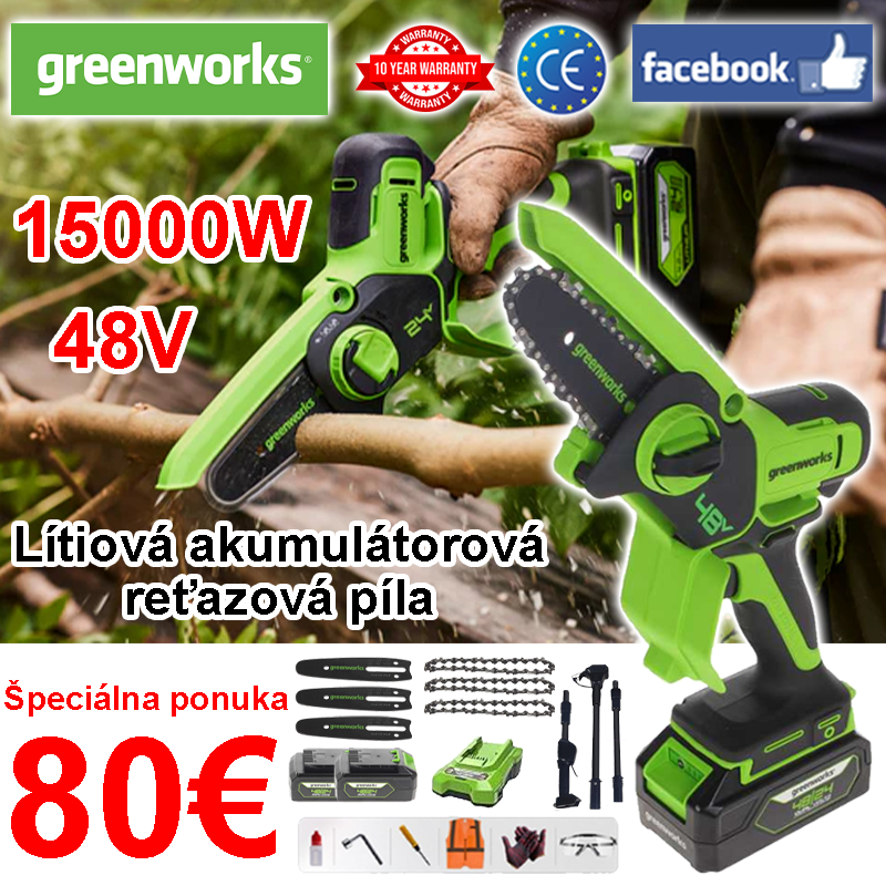 Na oslavu uvedenia elektrickej reťazovej píly Greenworks je pôvodná cena 160 €, teraz len 80 €, zostáva 21 kópií (limit jeden na osobu)